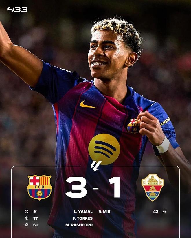 易边再战,拉什福德爆射破门,拉法-米尔两度中框。最终,巴萨主场3-1击败埃尔切。